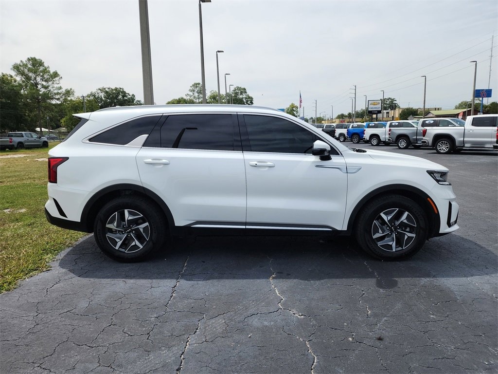 This 2023 Kia Sorento Hybrid EX in Snow White Pearl, features 1.6L I4 DGI Hybrid Turbocharged DOHC 16V LEV3-ULEV70, 3rd row seats: split-bench, 4-Wheel Disc Brakes, 6 Speakers, ABS brakes, Air Conditioning, Alloy wheels, AM/FM radio: SiriusXM, Apple CarPlay & Android Auto, Auto Dimming Mirror w/HomeLink (PNP), Auto High-beam Headlights, Automatic temperature control, Axle Ratio: 3.510, Brake assist, Bumper Applique Texture, Bumpers: body-color, Carpet Floor Mats, Delay-off headlights, Driver door bin, Driver vanity mirror, Dual front impact airbags, Dual front side impact airbags, Electronic Stability Control, Emergency communication system, Exterior Parking Camera Rear, Folding Cargo Tray, Four wheel independent suspension, Front anti-roll bar, Front Bucket Seats, Front Center Armrest, Front dual zone A/C, Front fog lights, Front reading lights, Fully automatic headlights, Heated door mirrors, Heated Front Bucket Seats, Heated front seats, Illuminated entry, Knee airbag, Leather steering wheel, Low tire pressure warning, Navigation System, Occupant sensing airbag, Outside temperature display, Overhead airbag, Overhead console, Panic alarm, Passenger door bin, Passenger vanity mirror, Power door mirrors, Power driver seat, Power Liftgate, Power passenger seat, Power steering, Power windows, Radio data system, Radio: AM/FM/HD Radio/SiriusXM Audio System, Rear air conditioning, Rear anti-roll bar, Rear reading lights, Rear window defroster, Rear window wiper, Remote keyless entry, Roof rack: rails only, Security system, Smart Key w/ Push Button and Remote Start, Speed control, Speed-sensing steering, Split folding rear seat, Spoiler, Steering wheel mounted audio controls, SynTex Artificial Leather Seat Trim, Tachometer, Telescoping steering wheel, Tilt steering wheel, Traction control, Trip computer, Turn signal indicator mirrors, Variably intermittent wipers, and Wheels: 7.0J x 17 Machine-Finished Aero Alloy: